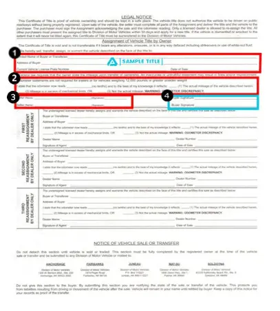 The back of an Alaska title has a section for sellers (red) and buyers (teal).